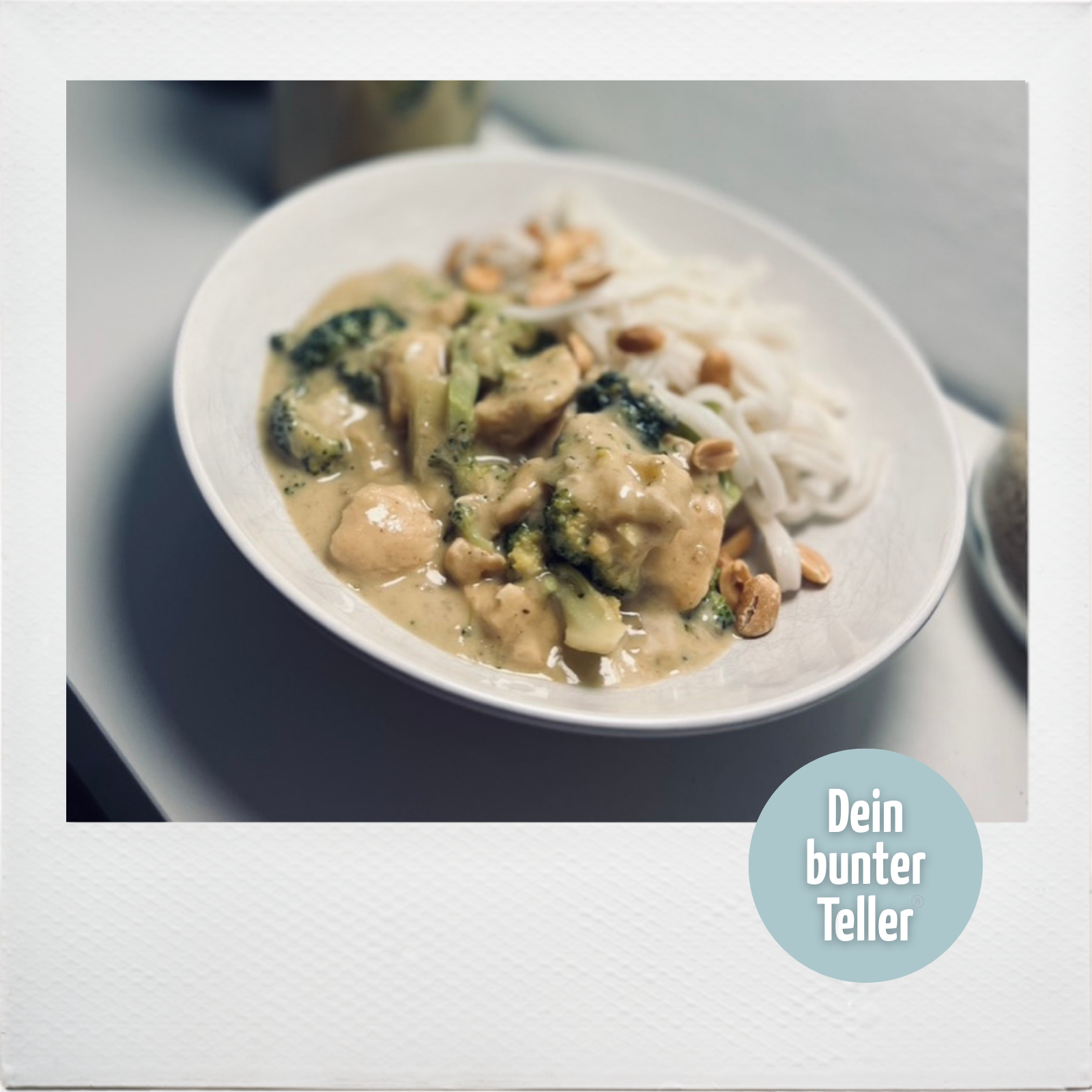 Erdnussmus in einem kleinen Teil Kokosmilch lösen, beides zum Topf geben, umrühren und aufkochen lassen, abschmecken.